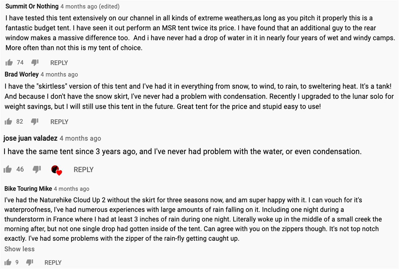 As Naturehike expands its international market, the brand reputations have been growing at an expected fast pace. From Amazon buyers' reviews to Instagram hashtagged comments from our customers, Naturehike's innovative design and reliable quality are recognized more and more on the international stage. Here is what people say about our products on Youtube.