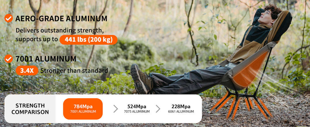 Crafted from 7001 aerospace-grade aluminum, this ultra-stable chair weighs just 2.87 lbs yet supports up to 441 lbs. Its reinforced X-frame stands firm on grass, gravel, or sand, ready for any outdoor environment.